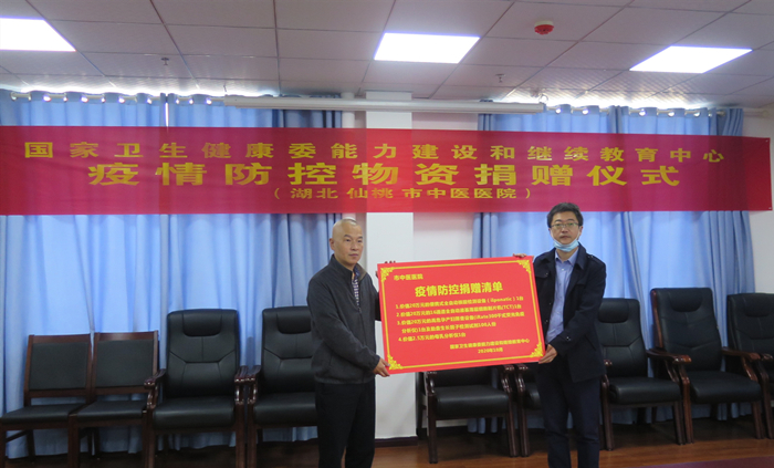 10月29日上午,由国家卫健委能力建设和继续教育中心主办的连心工程——共同防控疫情捐赠活动在仙桃市中医医院举行。国家卫健委能力建设和继续教育中心副主任医师何文杰等一行人出席了捐赠仪式。市卫生健康委副主任雷本淼、市中医医院党委书记顾庆炎等出席了捐赠仪式。爱心企业圣湘生物科技股份有限公司和北京新九陆生物科技有限公司代表参加活动。