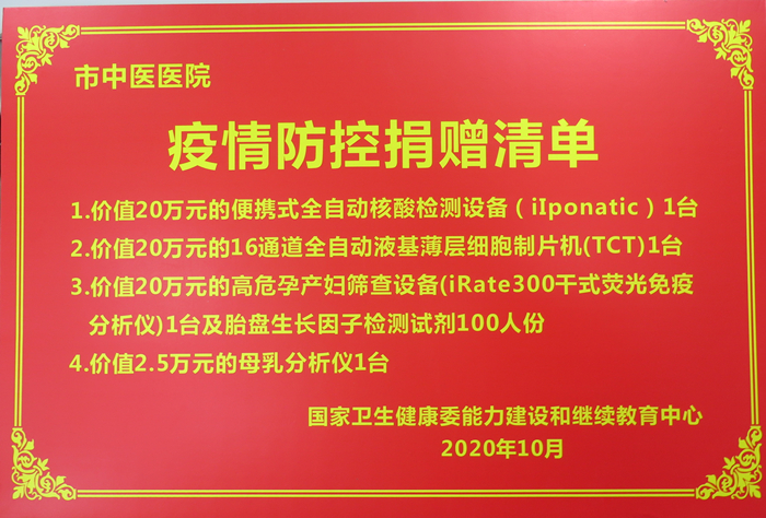 捐赠仪式由市中医医院党委副书记、副院长昌志红主持。捐赠仪式上,国家卫健委能力建设和继续教育中心向我院捐赠了核酸检测设备、液基薄层细胞制片机等医疗设备,该批医疗设备价值62.5万元,将用于我院疫情防控、中医妇幼保健事业发展。稍后,院党委书记顾庆炎致答谢辞,感谢前来参加捐赠仪式的各级领导和爱心企业,下阶段我院会继续发展中医药事业,为全市百姓健康做贡献!