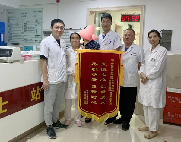 两月后患者来院复查,患者身体状况恢复良好,其家属向外科送来锦旗表示感谢,并与外科医护人员合影留念。