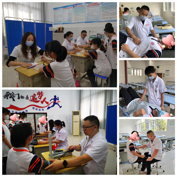 健康宣教的同时,另外还有一支十名党员组成的医疗队正在为即将参加军训的高一新生进行体能检测,通过血压与心率测量、心肺听诊、腹部触诊等相关检查,排查防范新生在军训过程中突发晕倒、摔伤、心梗、呼吸困难以及急性腹痛等安全事故的发生。